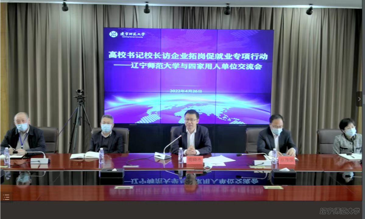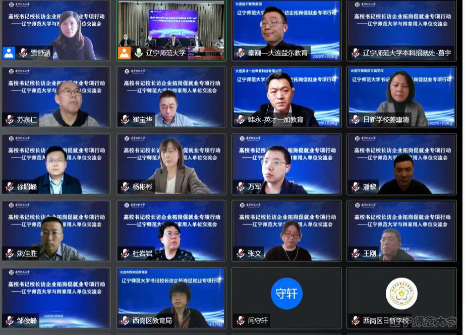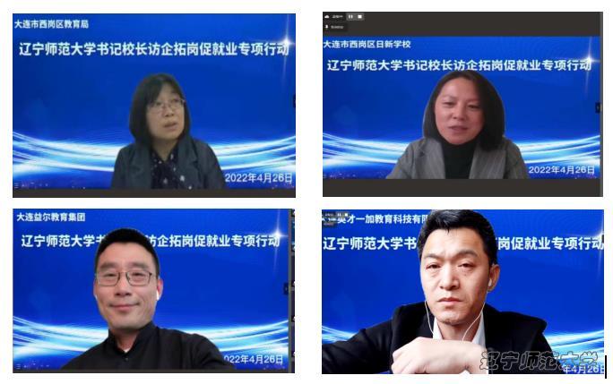 为贯彻落实就业工作“一把手”工程,积极响应和推进“高校书记校长访企拓岗促就业专项行动”,切实做好毕业生就业工作,4月26日,辽宁师范大学校长苑晓杰通过腾讯会议与大连市西岗区教育局局长张永春、大连市西岗区日新学校校长姜惠清、大连市益尔教育集团董事长秦巍、大连英才一加教育科技有限公司执行董事韩永进行线上交流,丛茂国副校长和相关部门负责人及教育学院领导班子成员参加线上会议。本次交流会由教育学院承办。